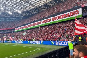 有西班牙记者晒出本场比赛毕尔巴鄂的球迷看台,可以见到许多支持巴勒斯坦的助威旗帜和横幅。