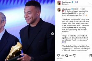 姆巴佩领取欧洲金靴:感谢队友、皇马和球迷,我们能赢得很多冠军